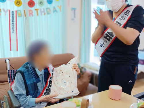 おたんじょう会では、ご利用者様にスタッフからプレゼントをお渡し🎁